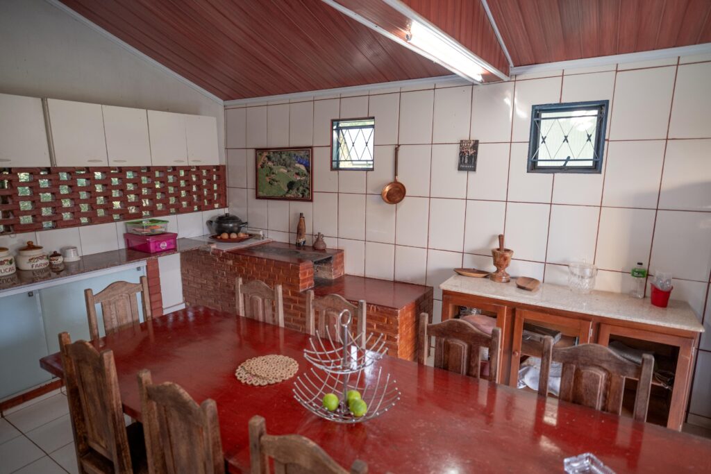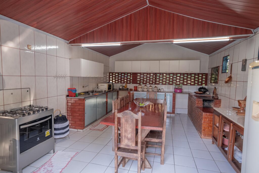 A casa sede, com aproximadamente 150 m², foi projetada para oferecer conforto, funcionalidade e aquele clima acolhedor de chácara.